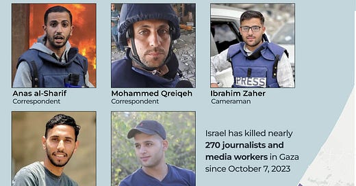Last night, Israel massacred the remaining team of Al Jazeera journalists it had working in the Gaza Strip. They were sleeping in their media tent, and an Israeli drone hit the tent at around 11:35 pm. For those of you who do not know, Al Jazeera was the last remaining news source that still had a team working out of Gaza.