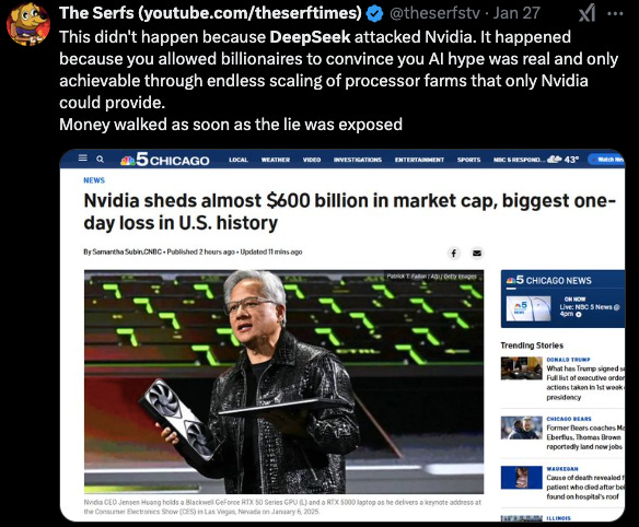 There’s another part to this, too: Nvidia is the company that provided the necessary chips for OpenAI to operate (called GPU’s). Nvidia saw a 17% stock plunge (worth a $589 billion loss), which is by far the single greatest one-day value wipeout of any company in history
