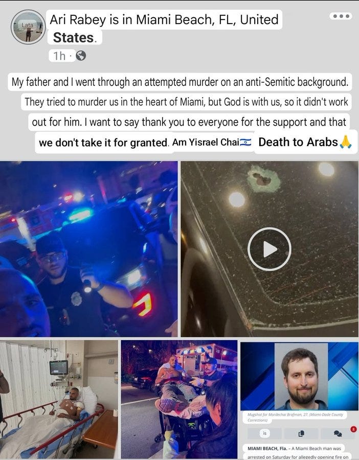 In the post, the son claims to be Israeli, saying that the attempted murder was “anti-Semitic” and that they wish for the death of all Arabs.