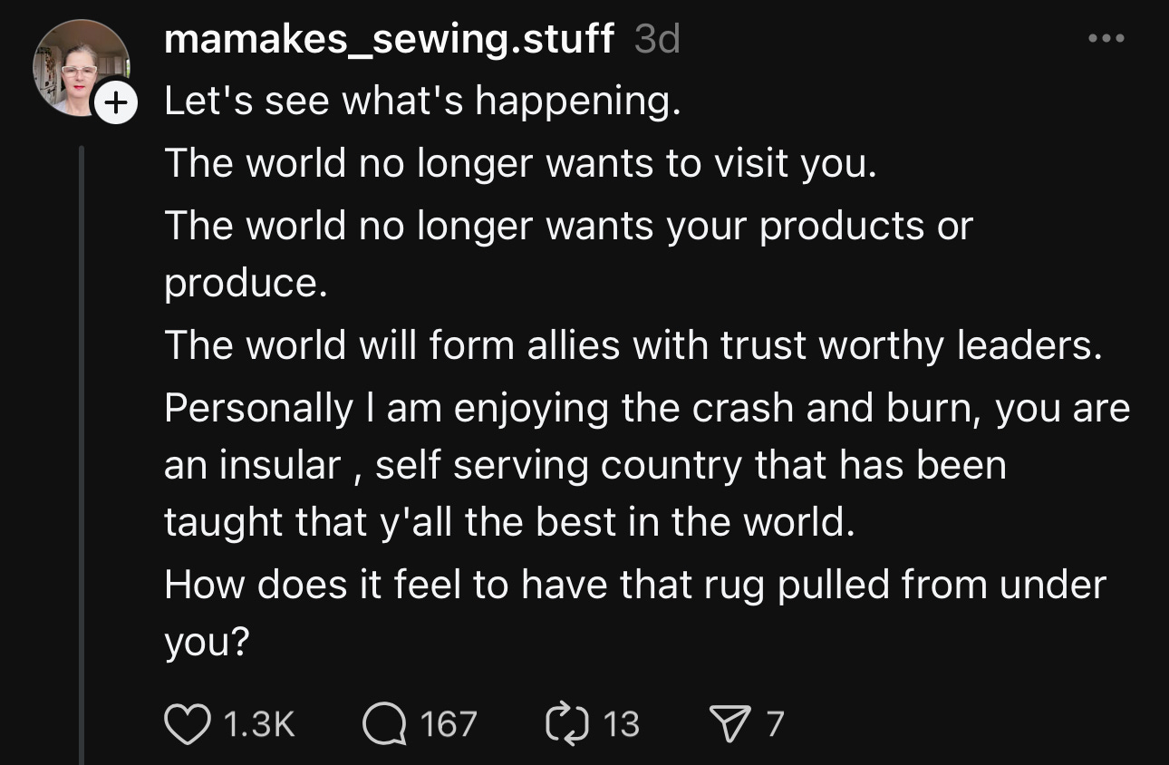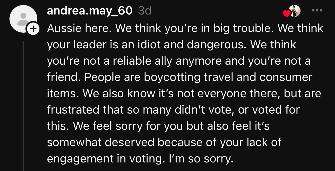 recently posted this thread asking folks who aren’t from America what they think about Americans and the responses were fascinating. I wanted to go through some of them so that you can see them as well:I didn’t know what to expect when I opened the thread responses, but honestly it’s truly astonishing that we are here. I mean, given the history of this country and the perpetual lack of education it really shouldn’t be, but sometimes I feel like I am living in a fever dream.